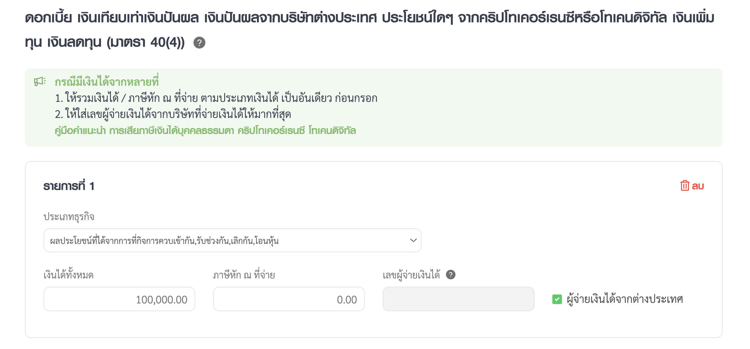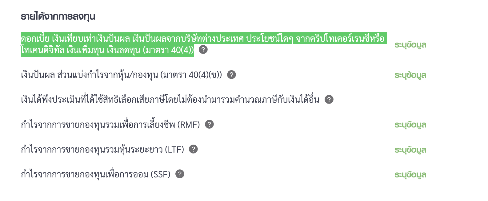 กด "ระบุข้อมูล" ที่ "ดอกเบี้ย เงินเทียบเท่าเงินปันผล เงินปันผลจากบริษัทต่างประเทศ ประโยชน์ใดๆ จากคริปโทเคอร์เรนซีหรือโทเคนดิจิทัล เงินเพิ่มทุน เงินลดทุน (มาตรา 40(4))" ดังภาพ