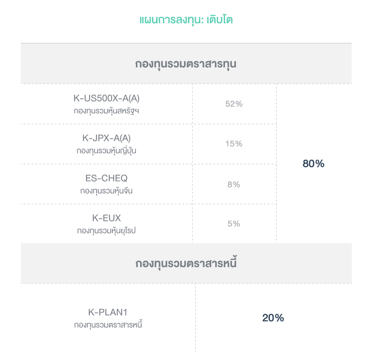 สัดส่วนลงทุน: กองทุนรวมหุ้น 80% และกองทุนรวมตราสารหนี้ 20%