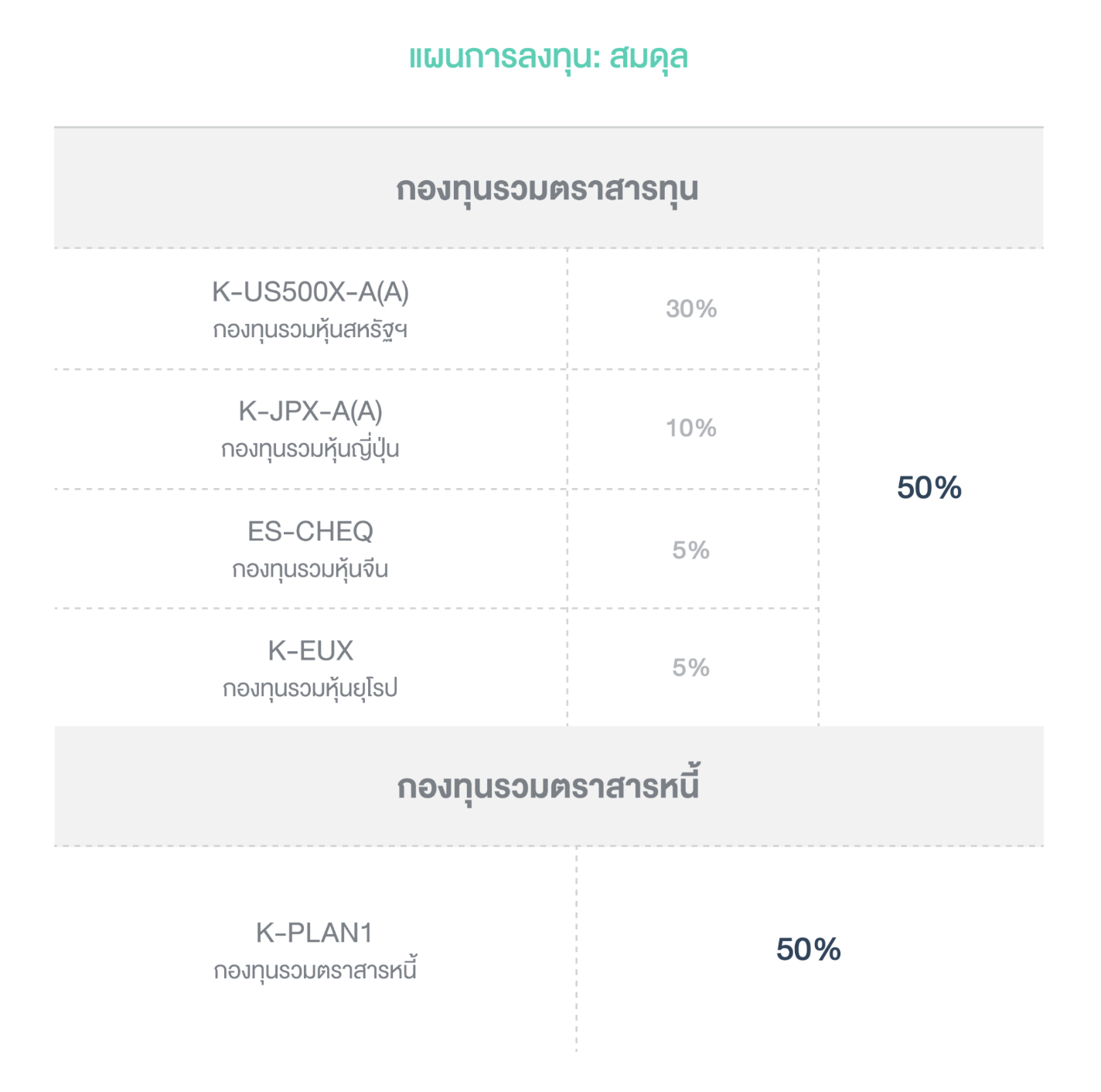 สัดส่วนลงทุน: กองทุนรวมหุ้น 50% และกองทุนรวมตราสารหนี้ 50%