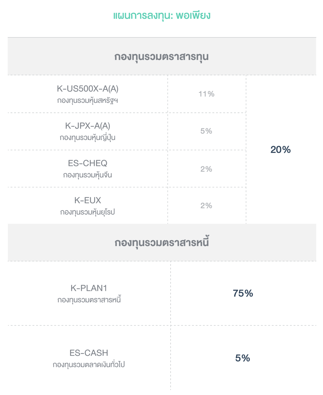 สัดส่วนลงทุน: กองทุนรวมหุ้น 20% และกองทุนรวมตราสารหนี้ 80%